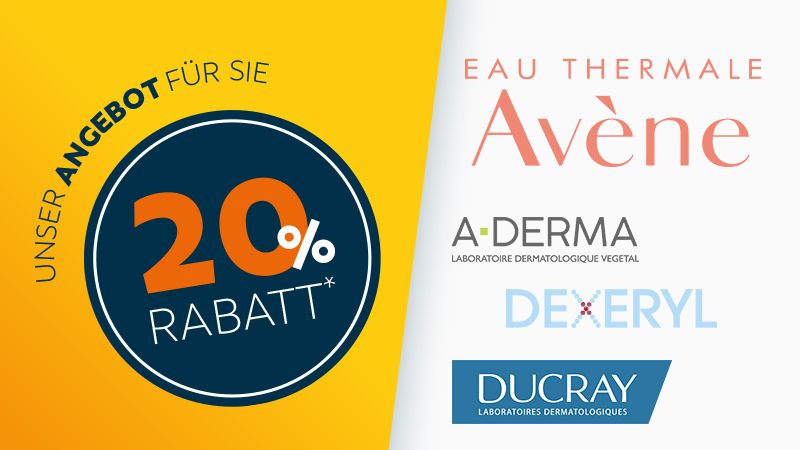 Wir bieten Ihnen an diesem Tag eine Hautanalyse und 20% Rabatt* auf alle vorrätigen Produkte von „Avène“, „Ducray“, „Dexeryl“ und „Aderma“.